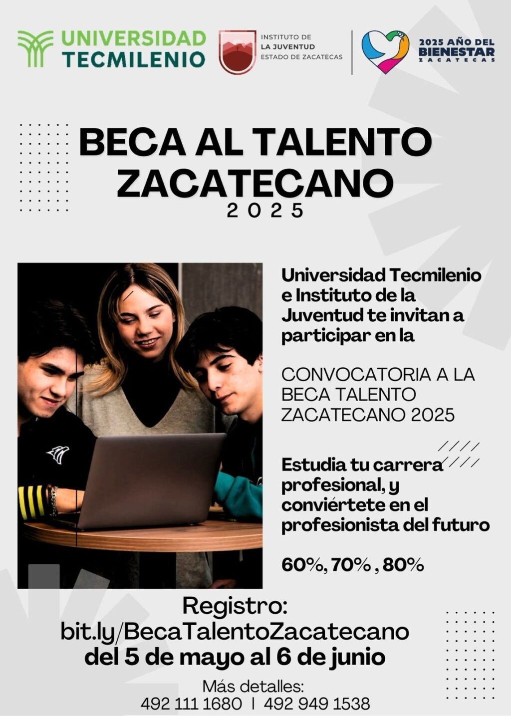 Zacatecas,(12-05-2025).-A través del Instituto de la Juventud (Injuventud), el Gobierno del Estado, que encabeza el mandatario David Monreal Ávila, se une con la Universidad Tecmilenio, a fin de ofertar 25 espacios en la convocatoria “Beca al Talento Zacatecano”, en su edición 2025.