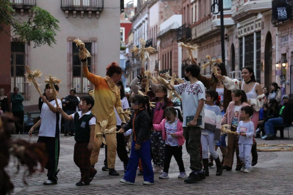 Por la tarde, en la Plazuela Miguel Auza, la compañía Armadilla AnimaL, originaria de Jalisco, presentó a las y los zacatecanos “Pasaje Maíz”, una intervención callejera con títeres de gran formato, elaborados con carrizo, paja y papel hecho a mano, materiales vegetales que a su vez evocaron el vínculo entre la tierra y la creación artística.