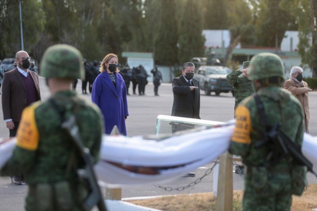 También la Delegada de Programas para el Desarrollo, Verónica Díaz Robles; Pascual Ortiz Mejía, jefe de Estación de Inteligencia; José Silvestre Urzúa Padilla, coordinador estatal de la GN; Oswaldo Cerrillo Garza, secretario técnico de la Mesa de Construcción de Paz; y miembros de las Fuerzas Armadas, la Guardia Nacional y la Policía Estatal.