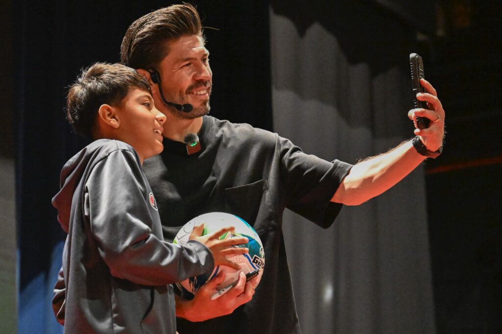 Zacatecas,(02-07-2025).-El exfutbolista y medallista de oro olímpico Oribe Peralta, quien anotó 206 goles en diversos clubes, compartió su inspiradora historia de vida, con un mensaje centrado en la perseverancia, el trabajo duro y la importancia de tener un “once ideal” de personas que apoyan los sueños.