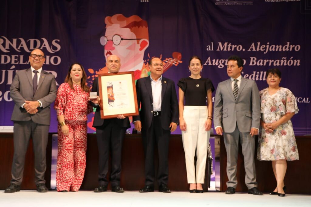 Jerez, Zac,( 26-09-2025).-En las Jornadas Candelario Huízar 2025, el Gobierno del Estado, a través del Instituto Zacatecano de Cultura (IZC) “Ramón López Velarde”, entregó la vigésima Medalla al Mérito Musical Candelario Huízar, al maestro Alejandro Augusto Barrañón Cedillo, en reconocimiento a su destacada trayectoria como intérprete, docente e investigador musical.