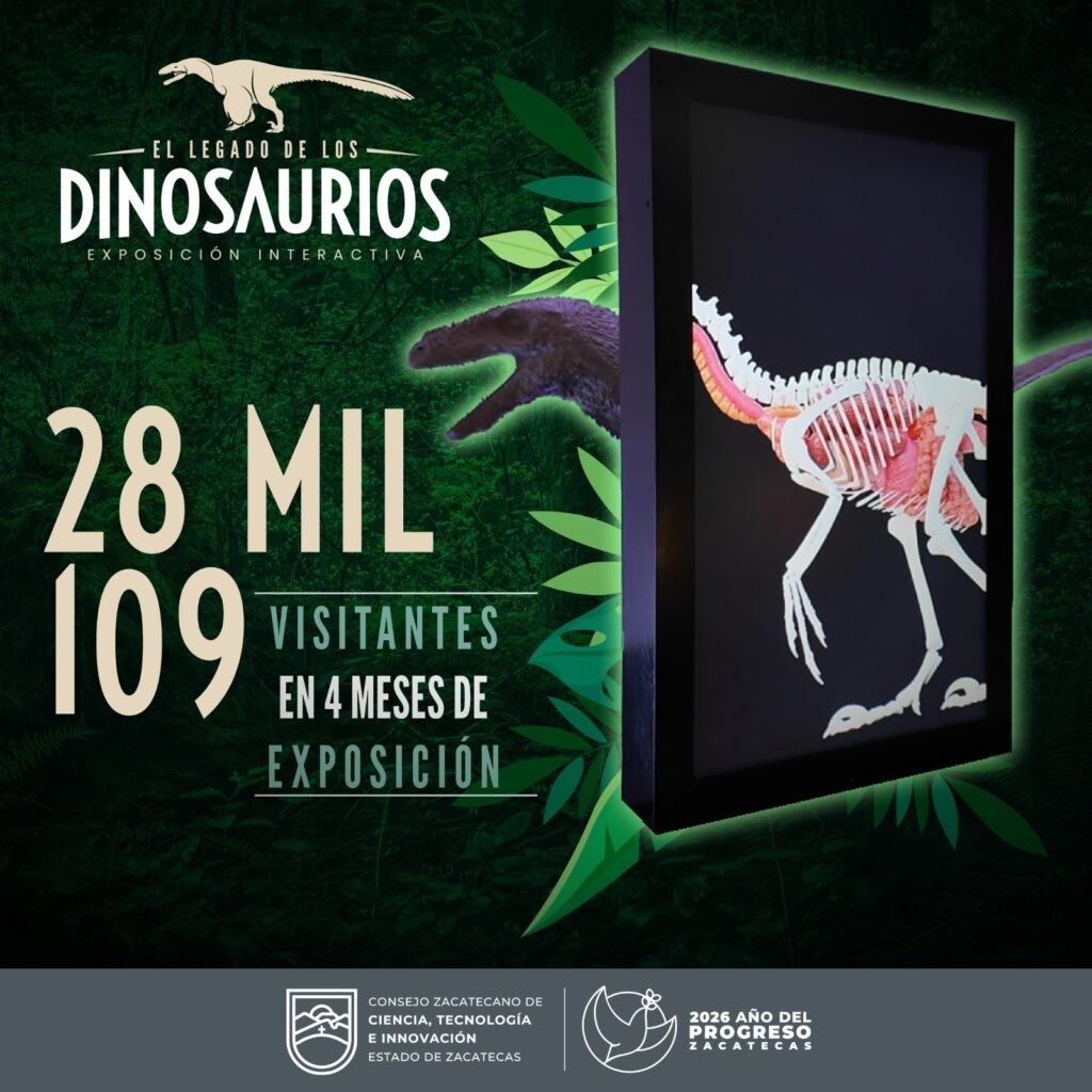 Zacatecas, Zac., 22 de marzo de 2026.- Con una afluencia de 28 mil 109 visitantes, durante cuatro meses, la muestra interactiva “El Legado de los Dinosaurios” se consolidó como una de las exposiciones temporales de mayor impacto reciente en el Centro Interactivo de Ciencia y Tecnología de Zacatecas Zigzag.